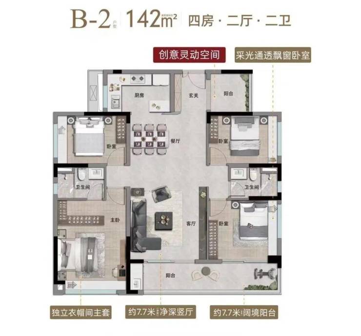 建面142平四房两卫,也是直厅设计,算是个飞机户型,四个卧室在饭厅两侧,可一定程度保证主人与长辈间生活互不干扰,7.7米长阳台