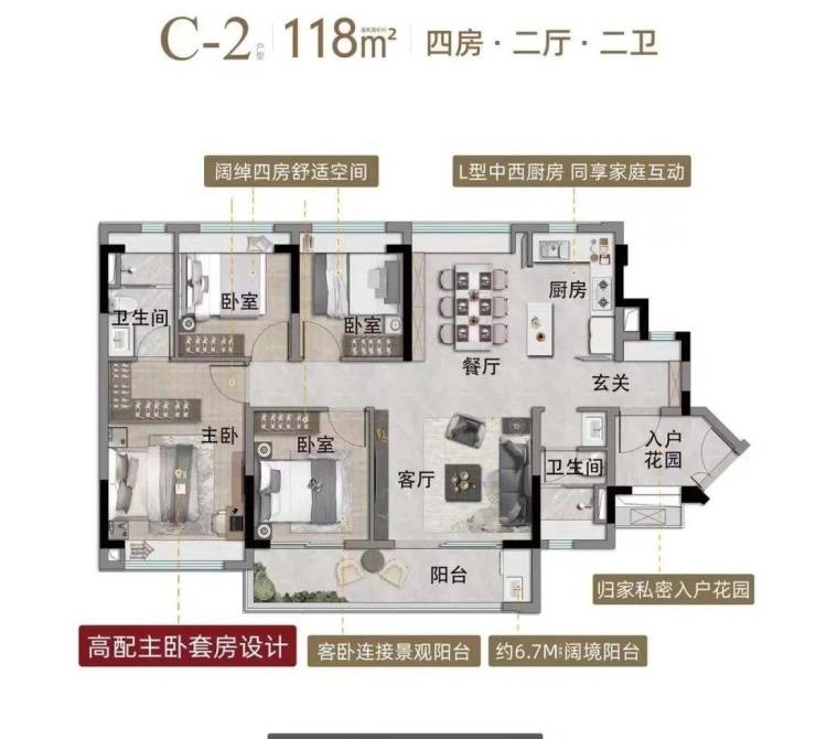 建面118平四房两卫,带入户花园,南北对流直厅布局,阳台约6.7米,主卧套房设计,配独立卫浴和转角衣帽间