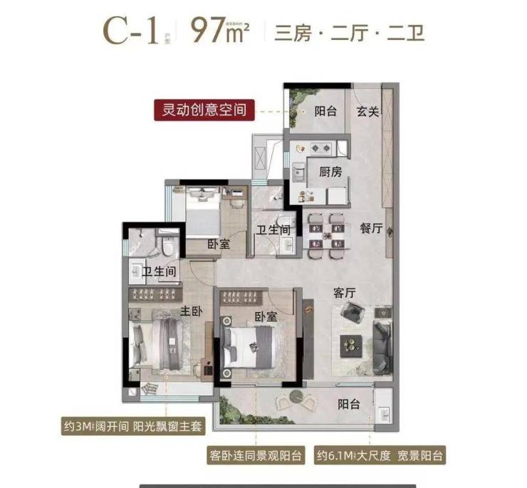 建面97平三房两卫,三开间朝南,入户玄关旁就是多功能空间,常规的直厅布局,约6.3米大阳台连通次卧,主卧和另一个次卧带飘窗