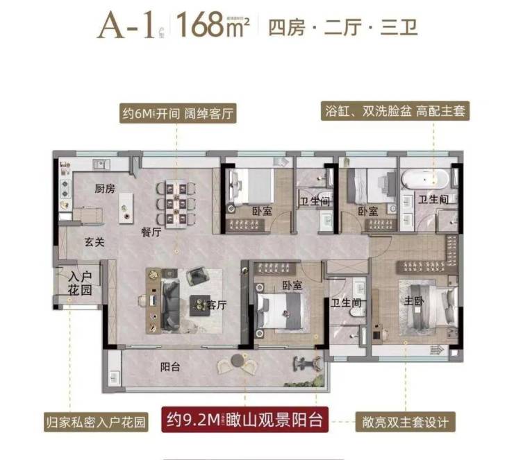 建面168平双主套四房,客厅开间去到6.2米,阳台长9.2米,层高约3.1米,主卧的独立卫浴面积将近8平米