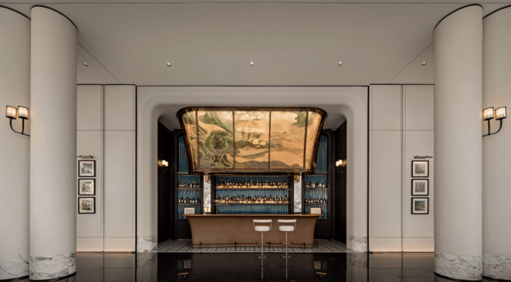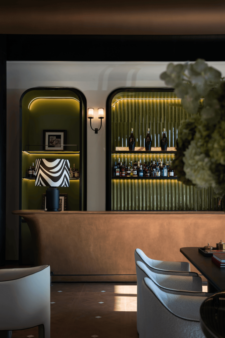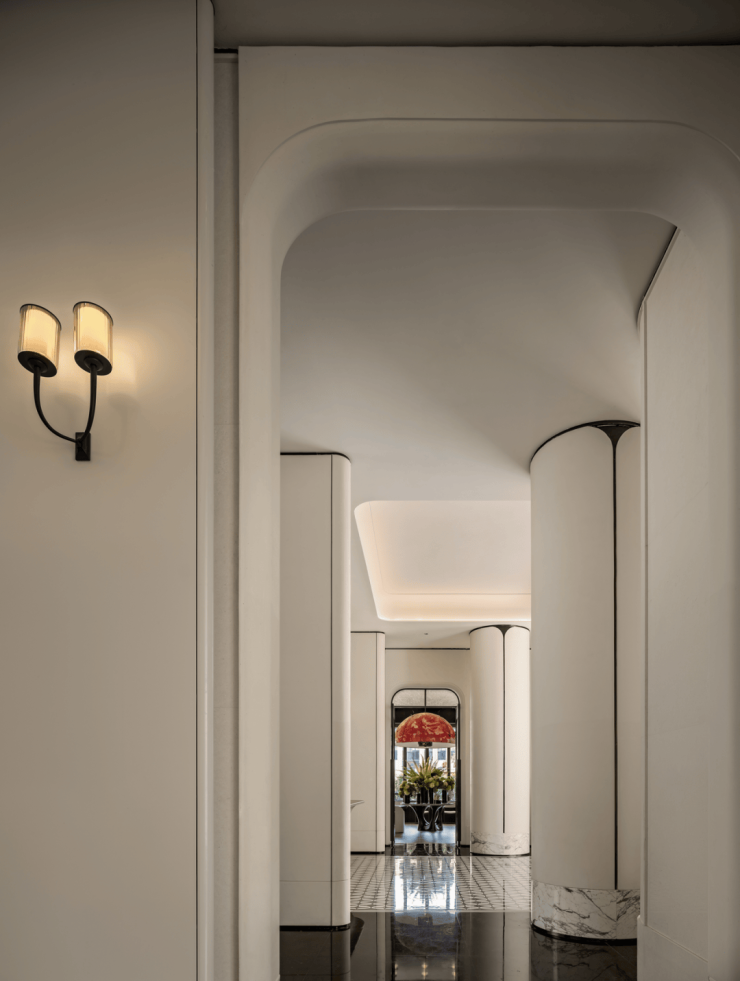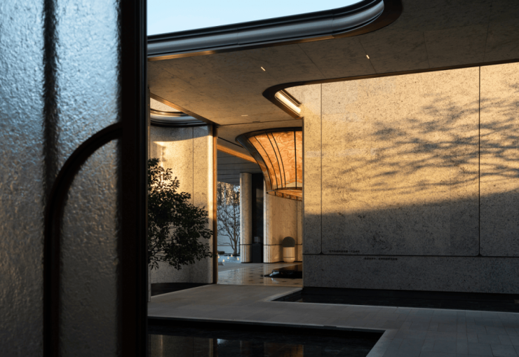 北侧,拱形墙面阵列与壁灯勾勒出富有仪式感的光之序列,营造出静谧而庄重的入场氛围;南侧则通过室内外互动吧台与通透玻璃幕墙,将自然景致温柔引入,在开放交融中营造松弛的场景。