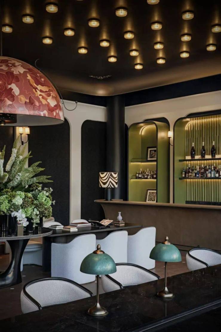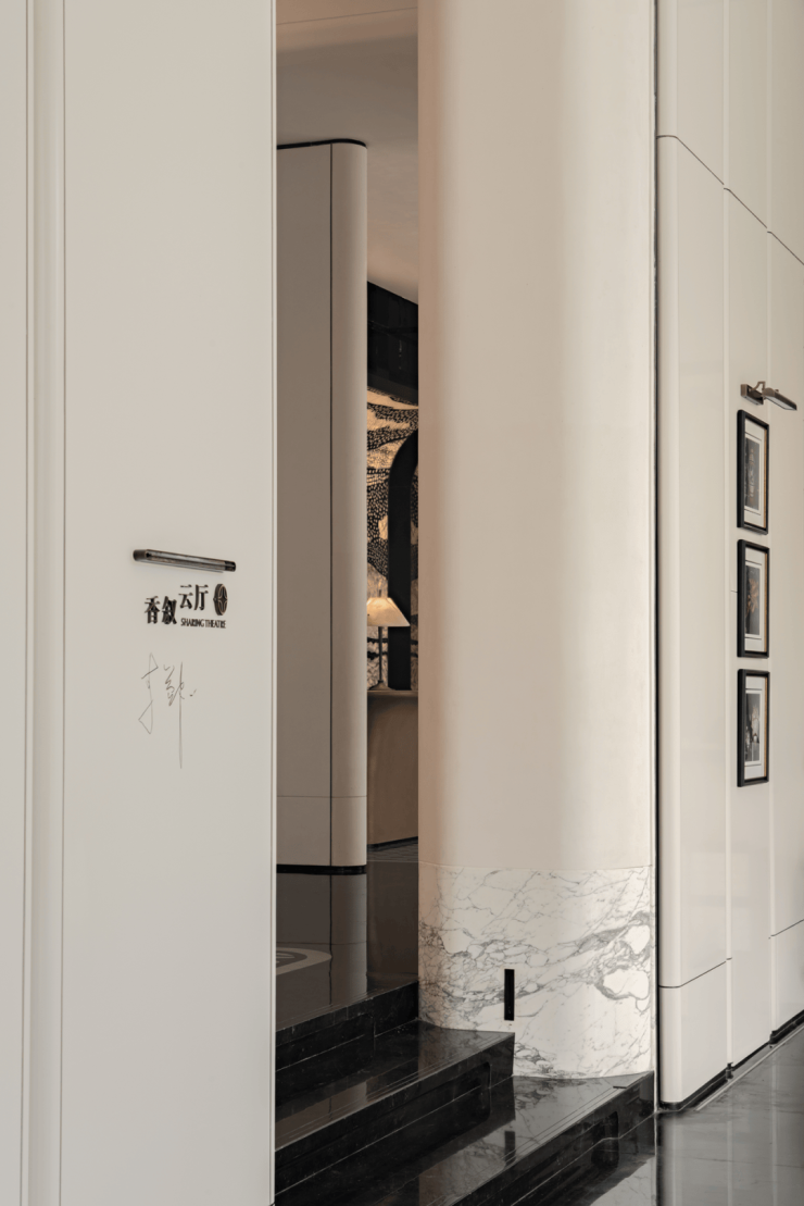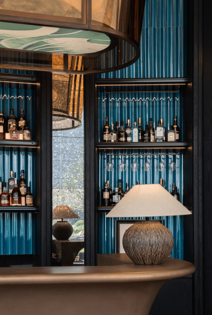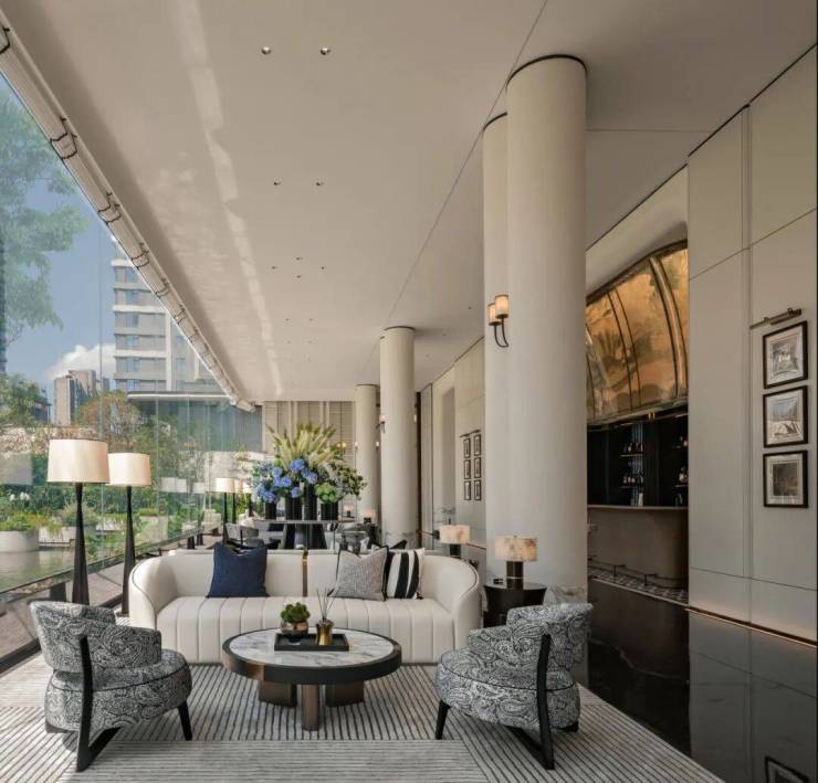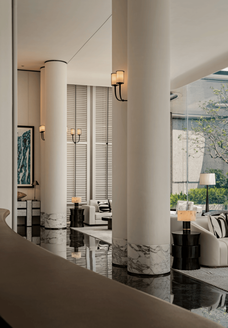 以海派典雅为基调的整体空间,浅调基底勾勒宁静氛围,深色金属细节点缀其间,屏风与立柱如律动音符,勾勒出空间的节奏与仪式感。通透的落地玻璃将自然与建筑融为一体,引景入室,消隐边界。