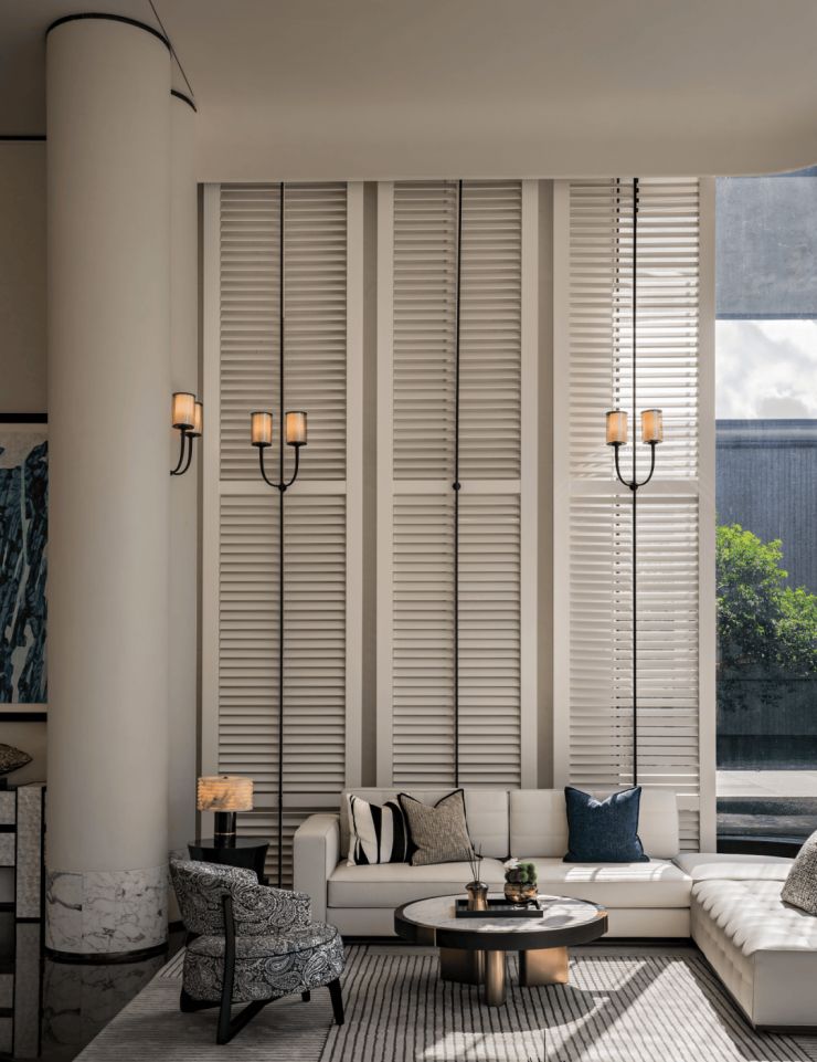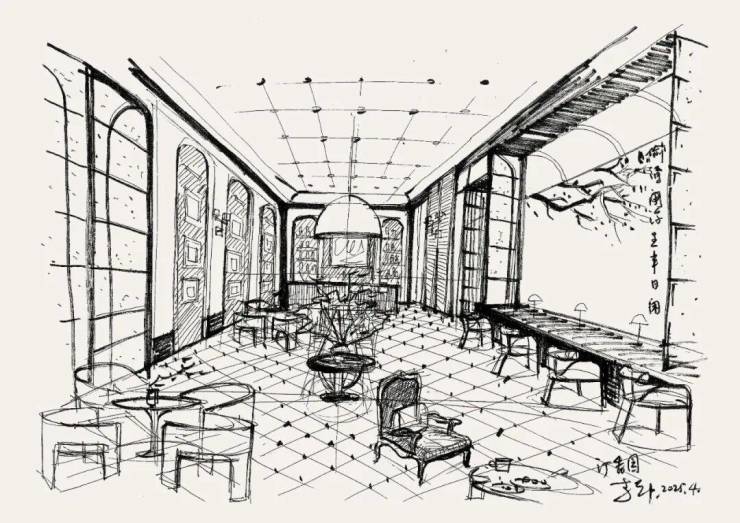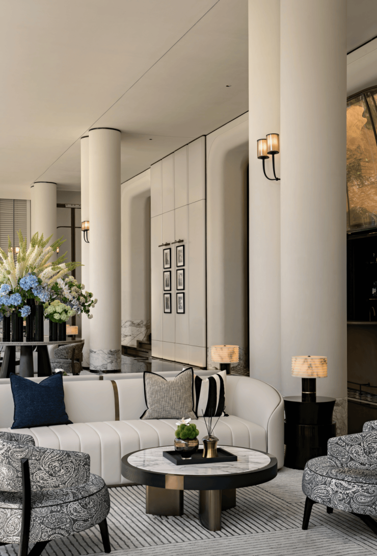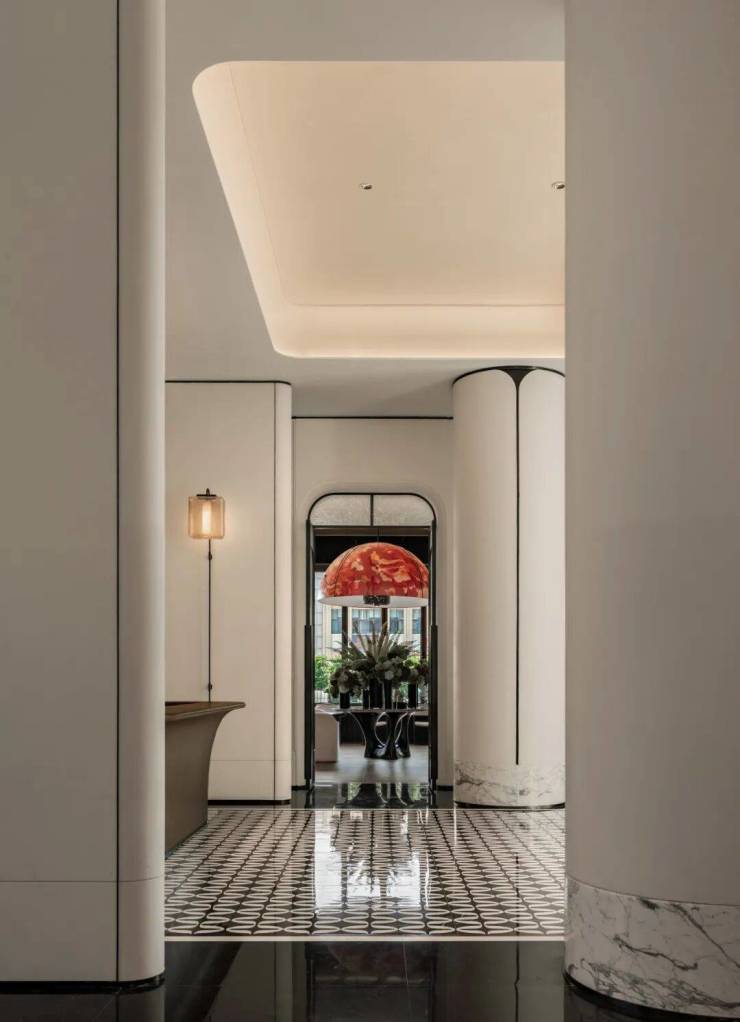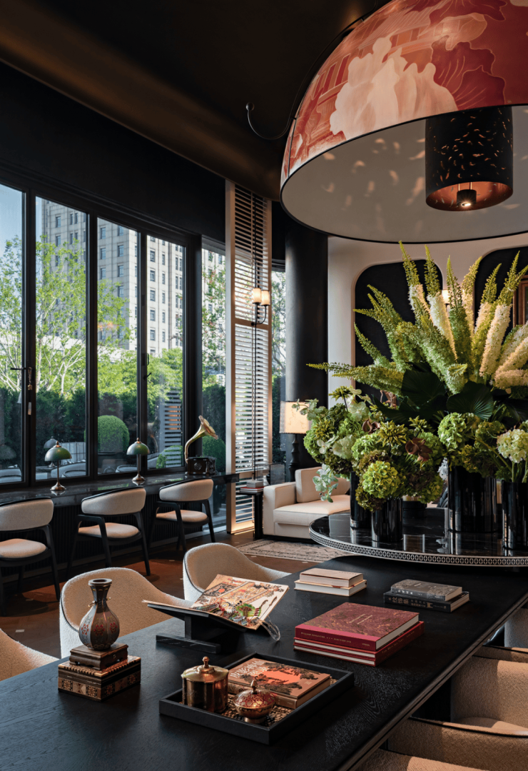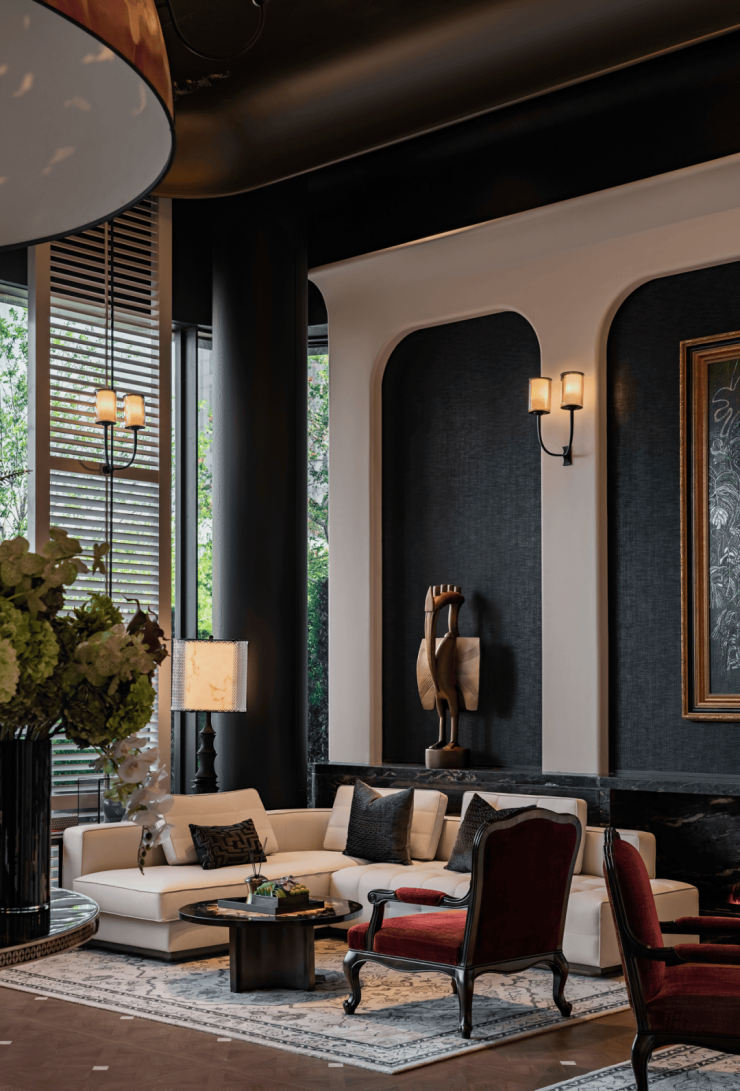 以海派典雅为基调的整体空间,浅调基底勾勒宁静氛围,深色金属细节点缀其间,屏风与立柱如律动音符,勾勒出空间的节奏与仪式感。通透的落地玻璃将自然与建筑融为一体,引景入室,消隐边界。