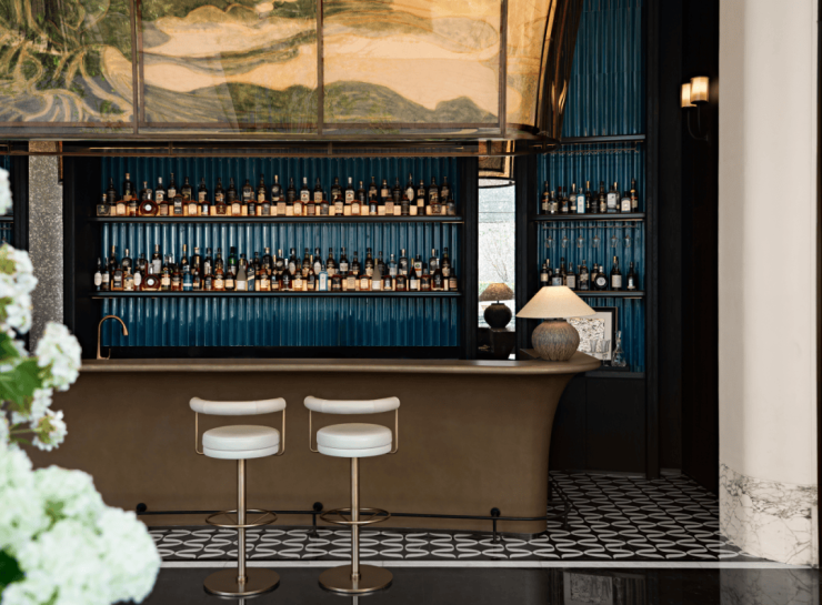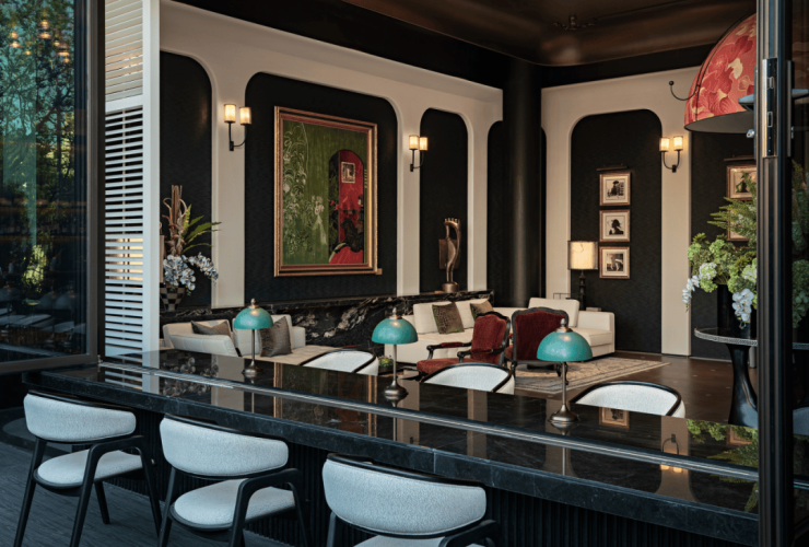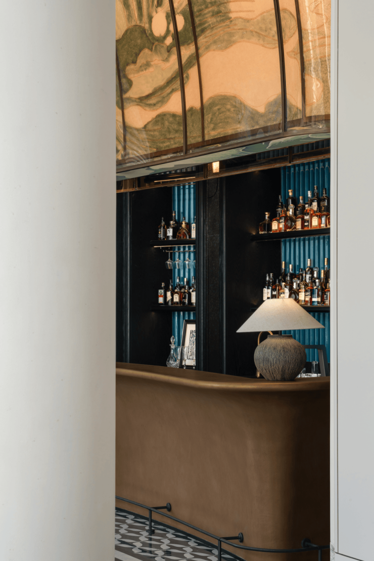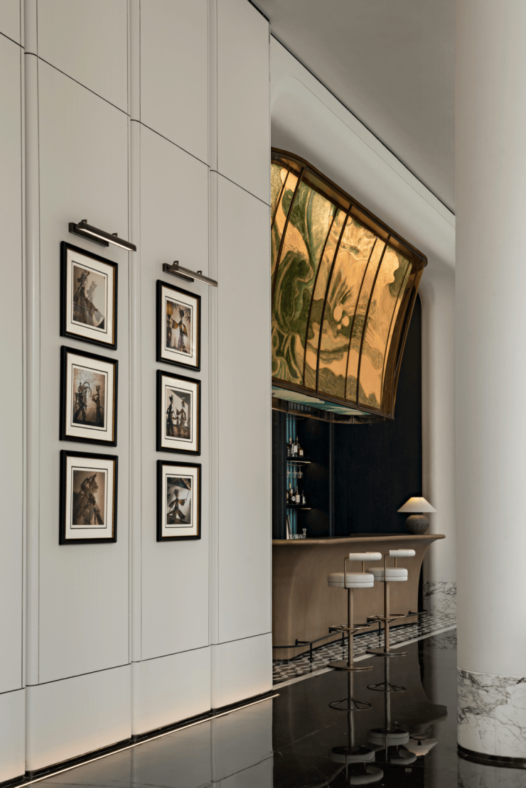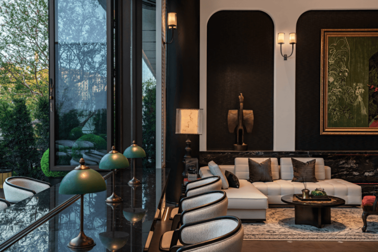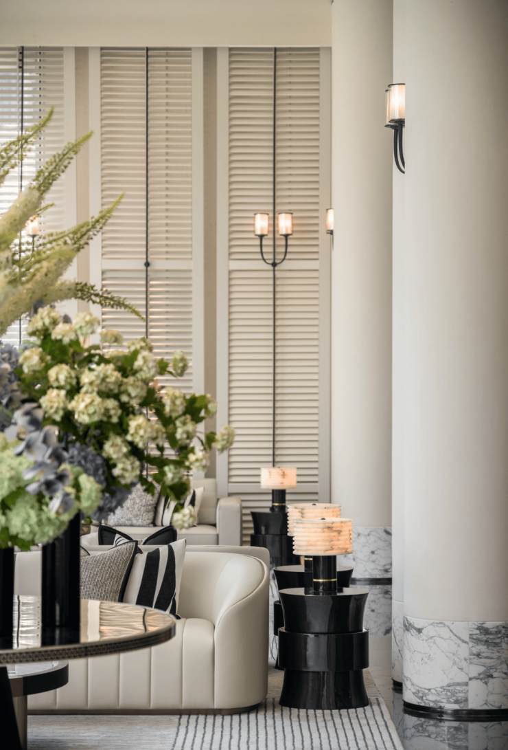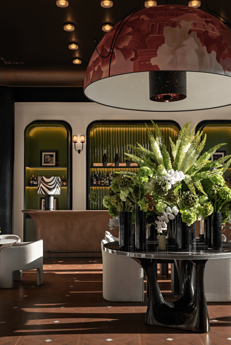 以海派典雅为基调的整体空间,浅调基底勾勒宁静氛围,深色金属细节点缀其间,屏风与立柱如律动音符,勾勒出空间的节奏与仪式感。通透的落地玻璃将自然与建筑融为一体,引景入室,消隐边界。