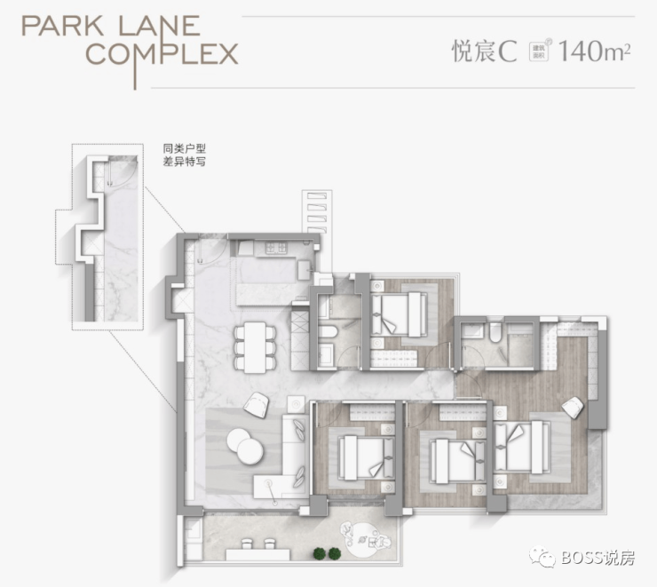 这个户型的空间感更强,主卧带U型飘窗,两个次卧以及客厅都有设置飘窗位,延展的空间多,假如将玄关旁的灵动空间并入客厅,整个起居室有约28平左右,室内的观感可以达到140平以上。