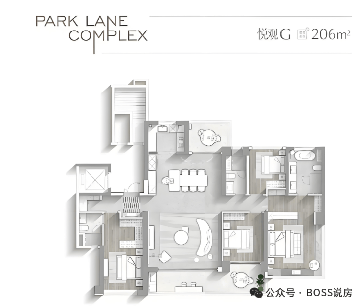 该户型自己一条梯腿,私密性比较强,这个户型做到五开间东南向,横厅设计,采光更好也更舒适。