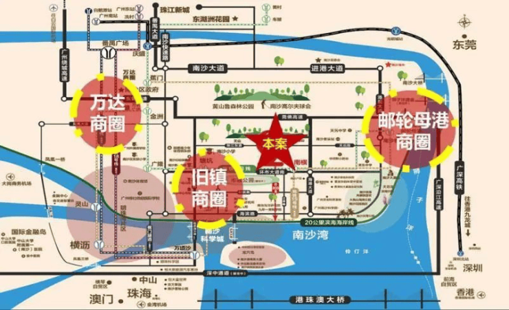 商业涵盖南沙大酒店、南沙花园酒店、天后宫等,项目地铁1站到邮轮母港,约800米到超级堤滨海海岸线。