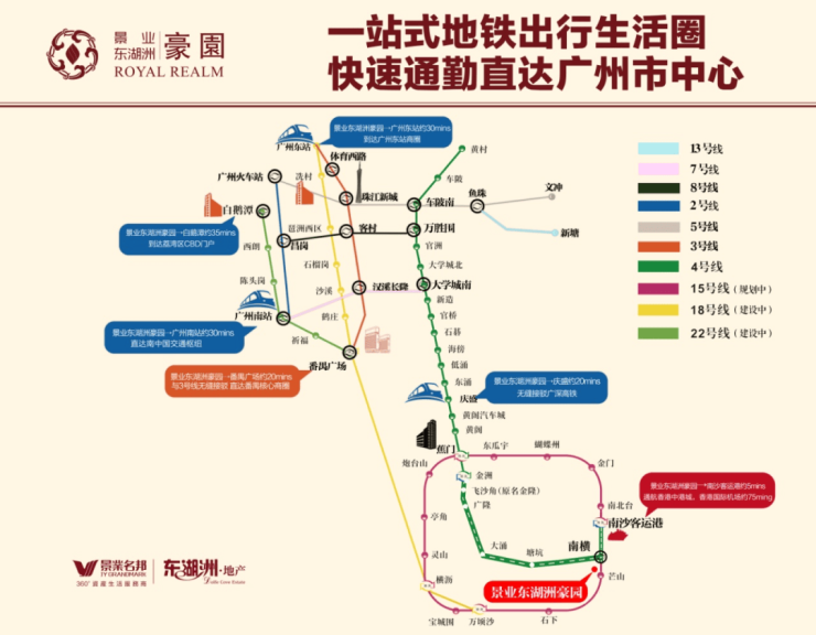 广州最快地铁18号线即将开通,项目3站公交接驳,1站直番禺广场商圈,5站45分钟畅达珠江新城,畅享45分钟CBD生活圈!