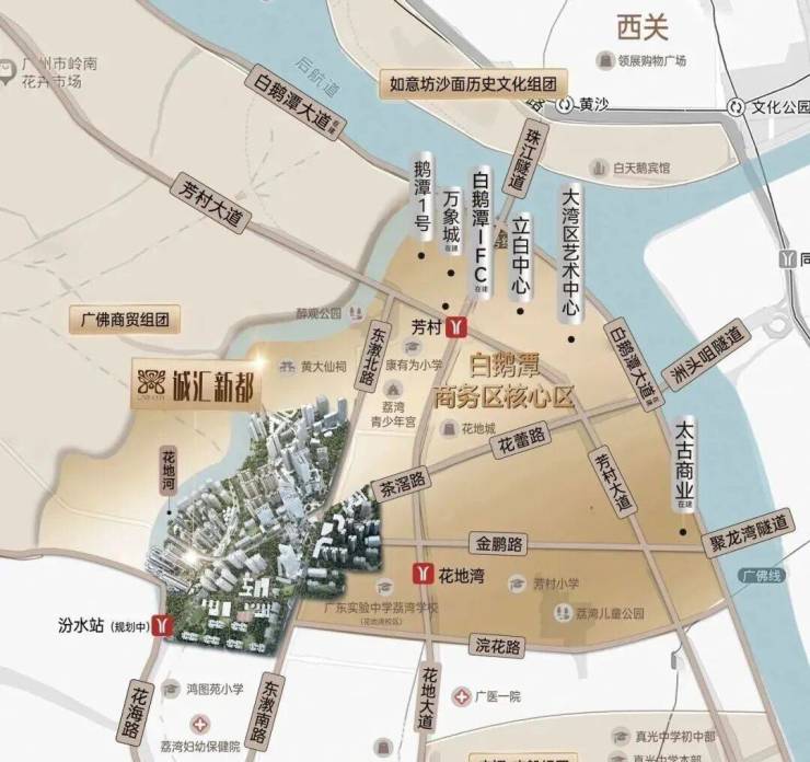 •诚汇新都占位白鹅潭CBD,总建面约200万㎡,直距3km(数据来源:高德地图测距)即享白鹅潭集高端商业、总部办公、高新产业于一体城市商业综合体;
