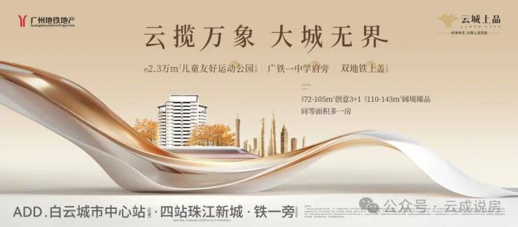 醇熟生活圈一应俱全,重塑品质生活新标杆📍 坐标:广州·18/22号线白云城市中心站·广铁一中(白云校区)侧📊 项目核心参数标准名称:云晟上品花园用地规模:约3.45万平方米总建筑面积:约17万平方米容积率:3.6绿化覆盖率:35%规划户数:1180户建筑布局:7栋百米高层住宅梯户配置:两梯六户车位配比:1:1.2(全小区)当前推售:1/2/3/5号楼主力户型:▫️约72-105㎡ 灵动3+1房▫️约110-143㎡ 阔景美宅交付标准:精品装修
