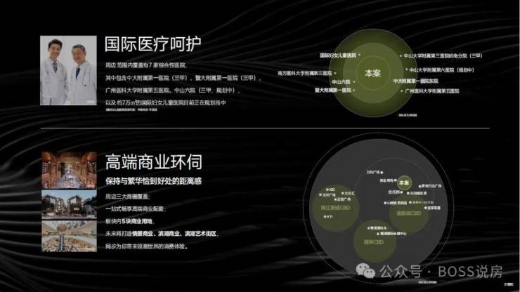 医院:周边 3km 范围内有 5 个一级及以上医院,周边覆盖 7 家综合性医院,包括三甲医院中大附属第一医院、暨大附属第一医院等,还有中山六院及 6.9 万㎡国际妇女儿童医院(规划中)