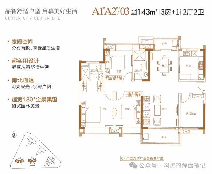 ●A1/2栋2梯4户108㎡(三房两厅两卫),143㎡四房两厅两卫)