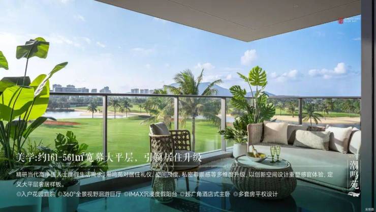 内部配套方面,潮鸣苑以“双轴一环三园”规划,创造出‘在果岭上长出的大平层’,并汲取《春江花月夜》灵感,打造‘潮鸣八境’流动庭院景观。同时,潮鸣苑拥有约1800 m²酒店式入户大堂、主题架空层、约1000 m²泳池、儿童戏水池、春知学堂等公共空间,并遵循热带海岸度假酒店模式,设置下沉庭院、社交草坪等等多元场景,满足休闲、社交、亲子等全维度需求。