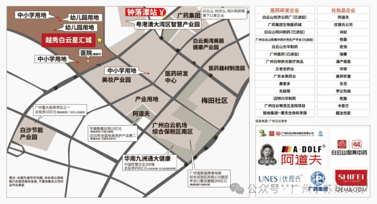 广州大健康产业基地:投资200亿,规模约等于22个广钢新城,已有何济公、明兴制、广药集团、和黄中药等29家知名健康产业企业入驻,健康城整体包含医药研制、职业教育、健康服务和健康养生四大功能片区;