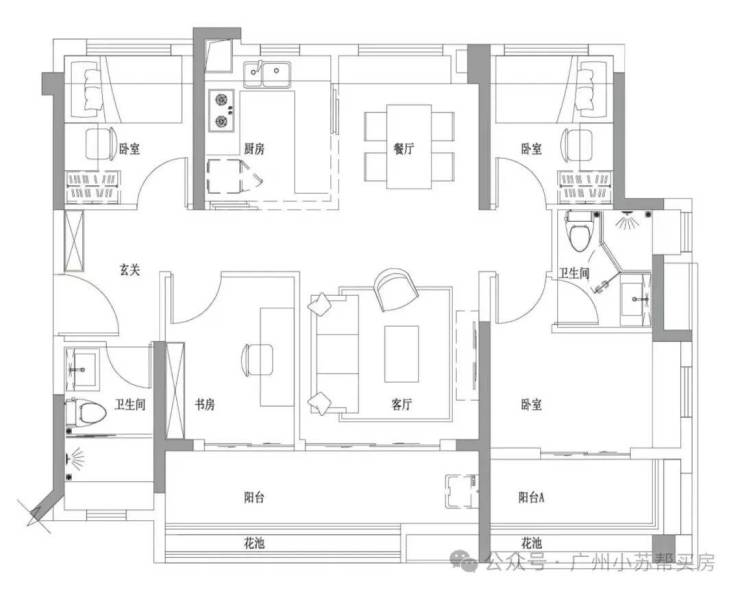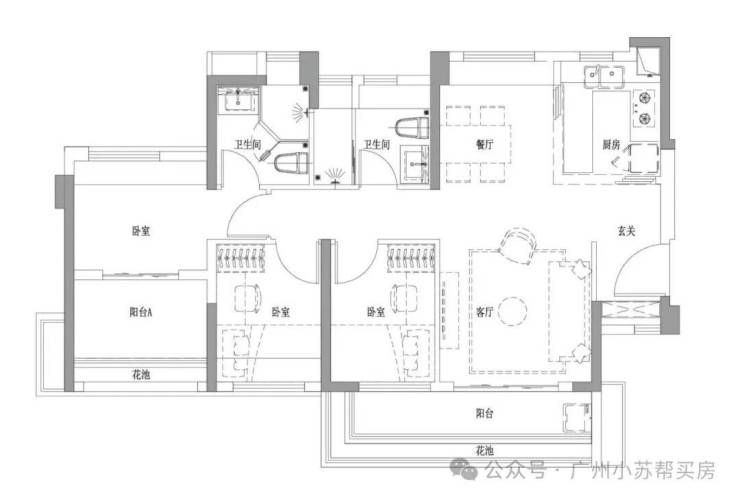 4、小面积也是做到全南户型,74房能做成三房两卫,户型设计不错。