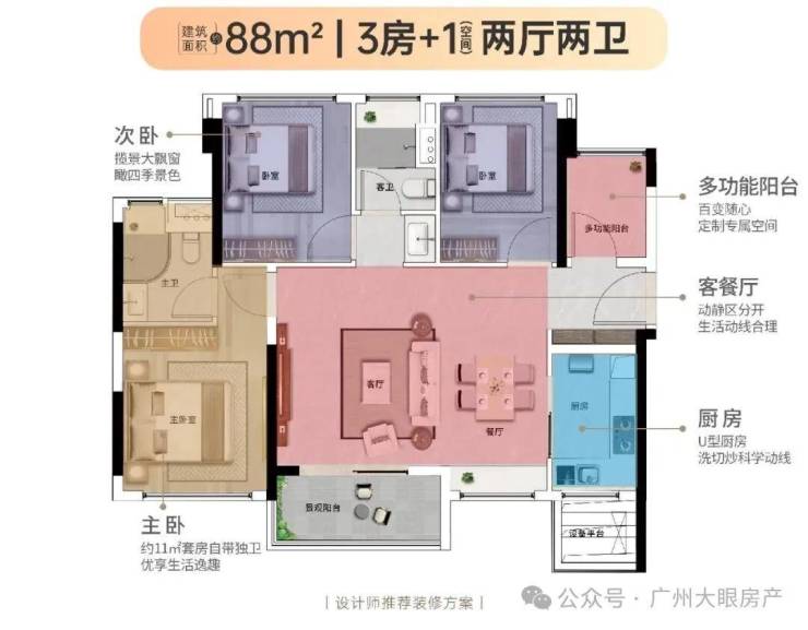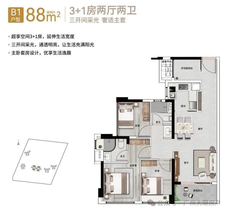 【88㎡3+1房2厅2卫】经典竖厅格局,三开间采光,近11㎡主卧套房设计,优享生活逸趣,稀缺小户型,低总价晋阶天河