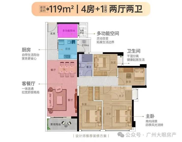 【119㎡4+1房2厅2卫】南向通风三开间采光,经典竖厅,南向奢阔主套,配步入式衣帽间,改善户型首选,低总价换房天河