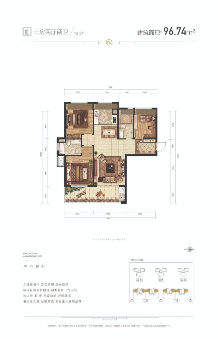 E户型面积:建筑约97㎡ 3房2厅2卫