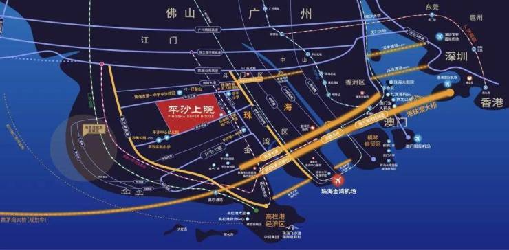 项目以南经珠海大道与港珠澳大桥西沿线相连,可快速通达港澳。项目周边西部沿海高速、高栏港高速等与黄茅海大桥对接,可通达珠三角各地,与广东省其他城市形成1小时经济圈。