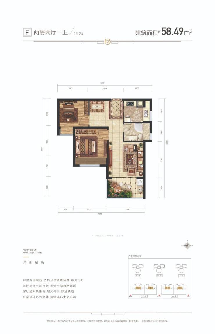 F户型面积:建筑约58㎡ 2房2厅1卫