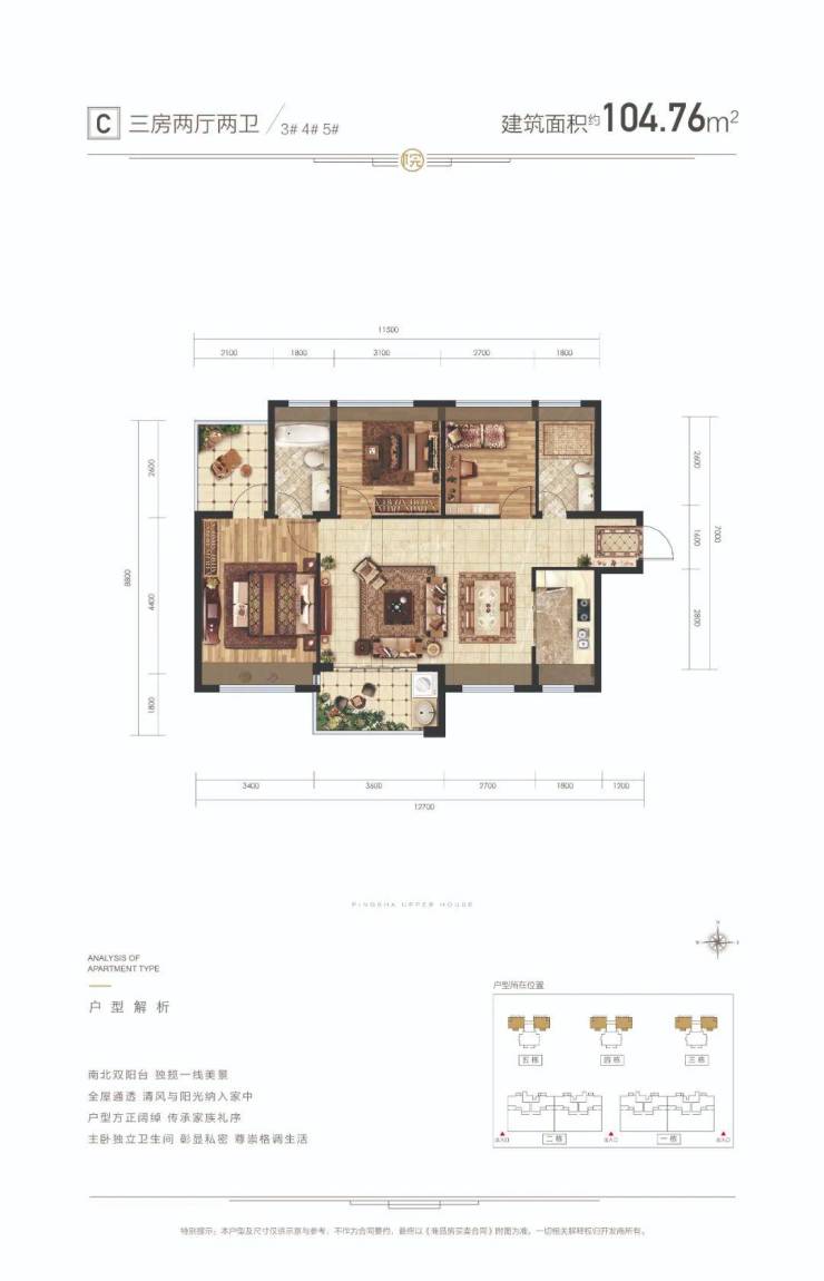 C户型面积:建筑约104㎡3房2厅2卫