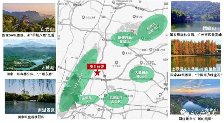 广州中轴线上最具景观资源的一段,自带豪宅宜居属性。白云山、南湖景区、天鹿湖、帽峰山、六片山、龙洞生态景区六大生态景区四面环绕