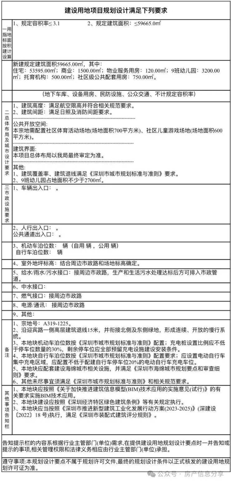 本宗地规定建筑面积59665平方米,包括:住宅53595平方米、商业1500平方米、物业服务用房120平方米、9班幼儿园3200平方米、托育机构500平方米、社区级公共配套用房750平方米