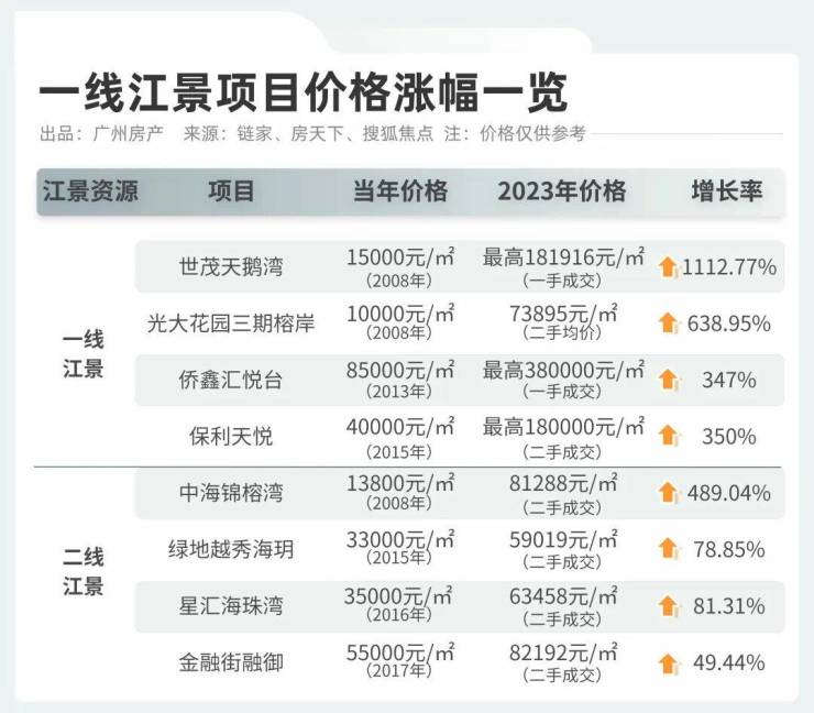 据统计,2013年至今,广州仅出让9宗临江地块,稀缺程度可想而知,江景豪宅最高涨幅高达1112%。