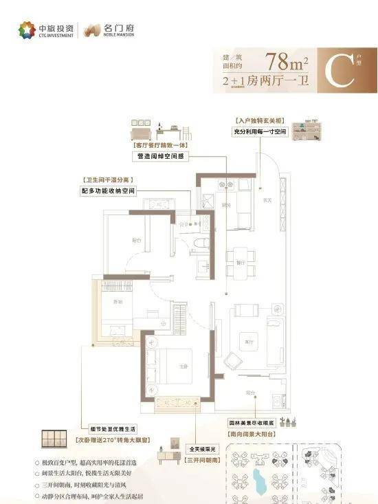 C户型:建面约80㎡ 2+1房两厅一卫