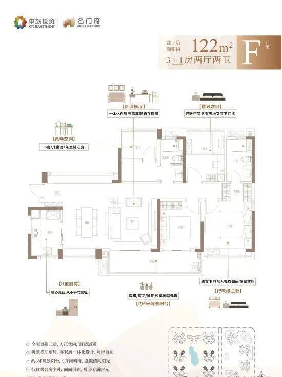 F户型:建面约122㎡3+1房两厅两卫