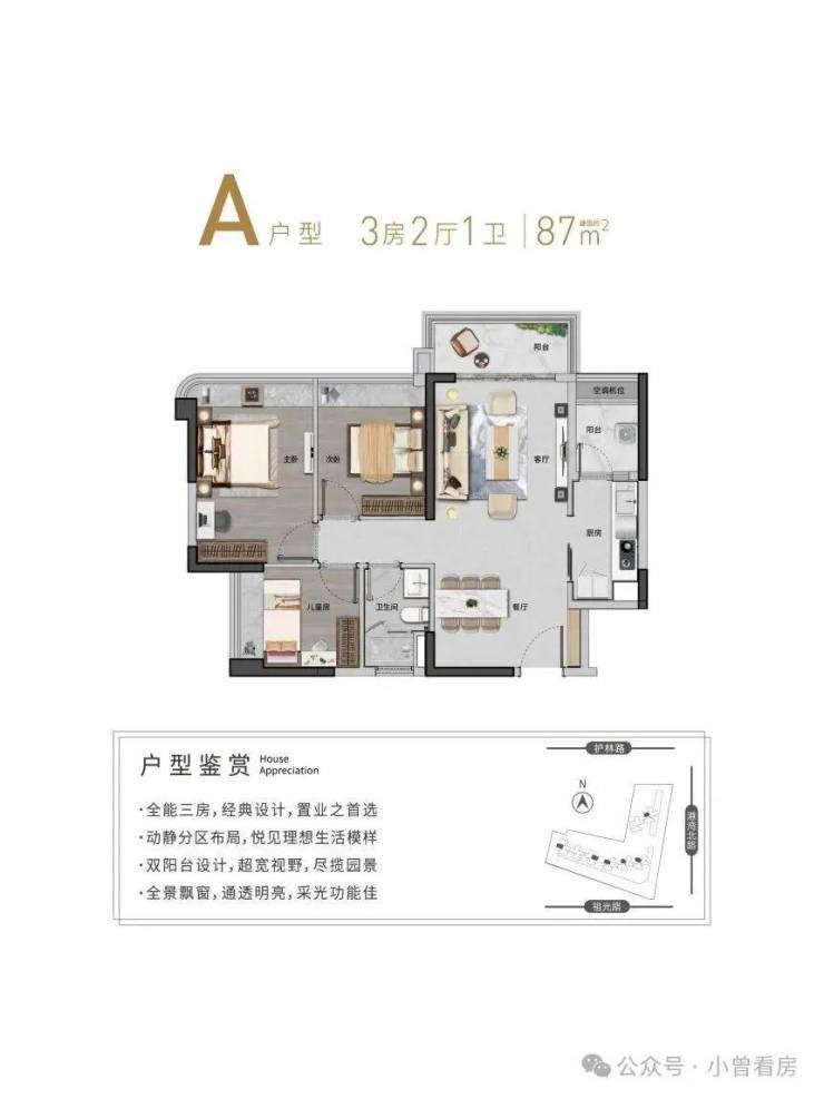 其中 87㎡三房两厅一卫是刚需主力,总价约 340 万起,三开间朝南,客厅衔接 5.8 米阳台,主卧带飘窗,厨房预留双开门冰箱位,虽然面积紧凑,但空间利用率较高,很适合在周边上班的年轻白领。