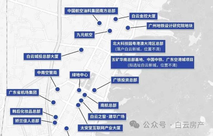 白云新城依托航空枢纽优势,越来越多的大型高新科技企业总部进驻于此,广铁集团机场集团、中南空管局、绿地中心、白云金控大厦、太安堂产业大厦、广州娇兰佳人、九元航空、广铁设计院、南航大厦等一大批总部经济项目已投入使用或即将投入使用。据统计,白云新城已有15个总部企业,强势赋能白云新城。