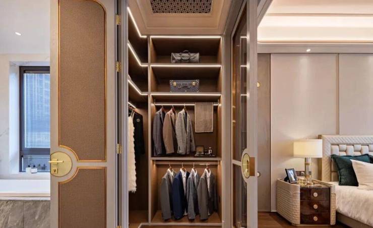 ✨时尚衣帽间采用扪皮、玫瑰金金属外框、夹丝玻璃搭配设计,超大空间满足男女主人放置衣物饰品的需求;