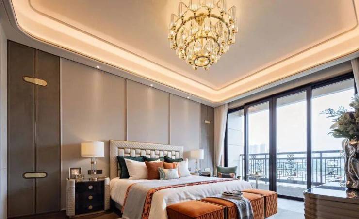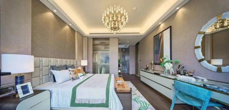 🌙 主卧承接青绿山水的主调,扪皮主材点缀金属线,现代与古典相融;