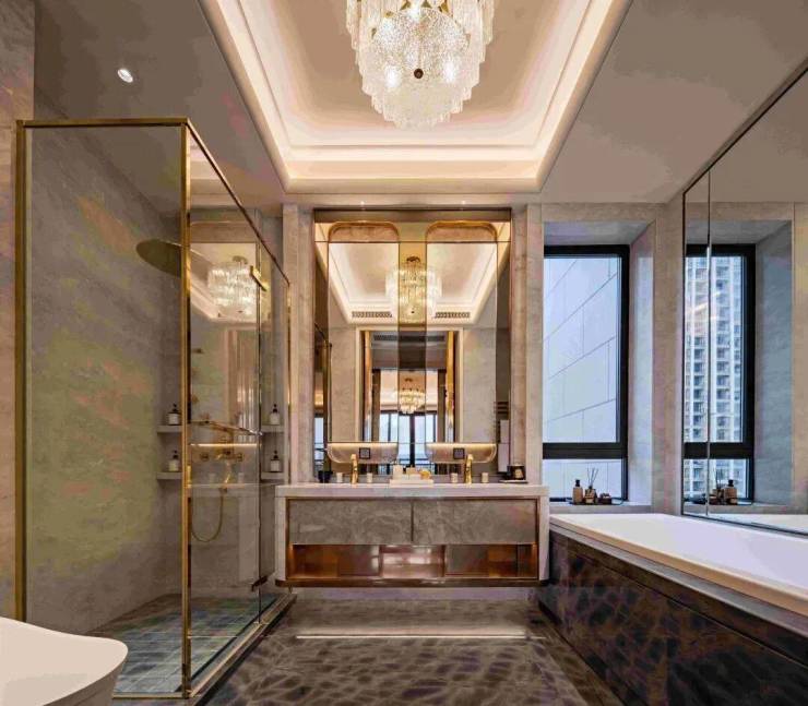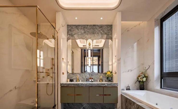 🌙 主卧浴室墙面采取马德望白奢石,地面是普拉达绿奢石;