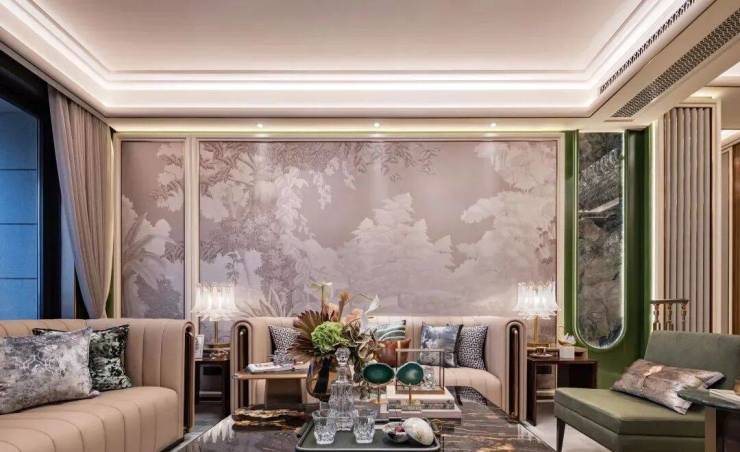 ✨客厅背景墙为阿玛尼底材刺绣墙艺,营造清雅美学。