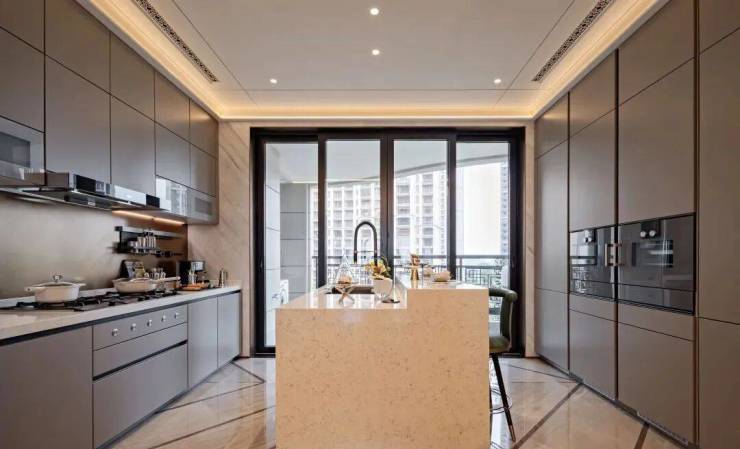 🌟墙壁使用香雪灰奢石,厨房门采用玫瑰金金属外框玻璃门;