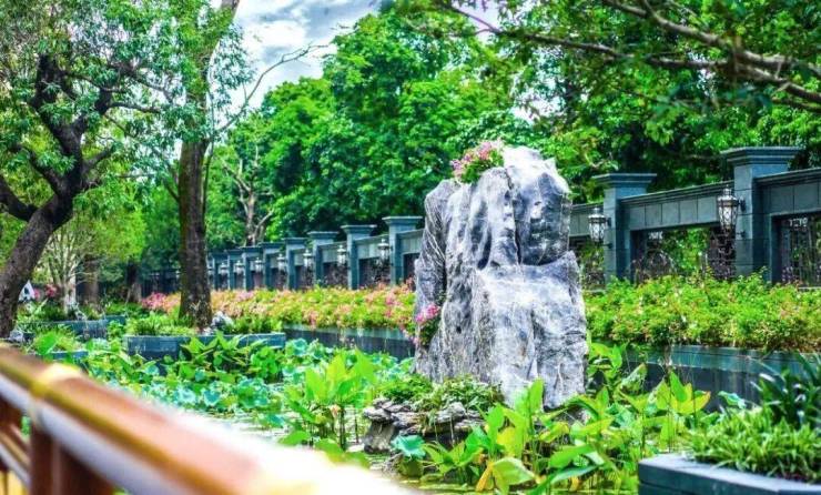 以水为核心,以约200多棵高大乔木、约29组富贵绿石及英石为主要景观,大量荷花等水生植物作为衬托,园林和建筑融合得美轮美奂
