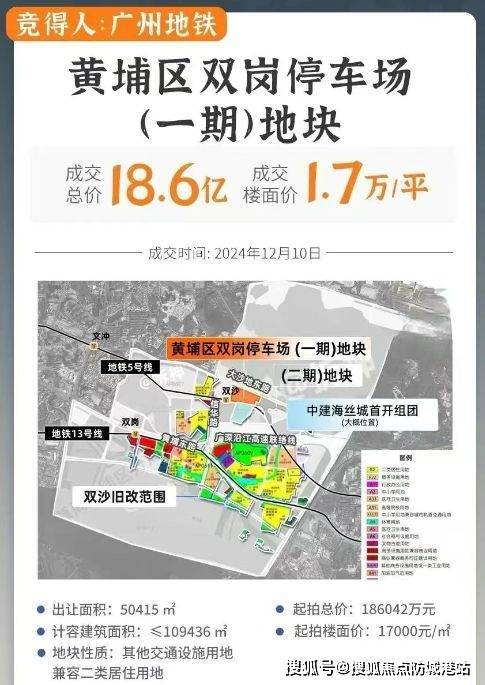2024年12月10日,广州地铁以底价186,042万元竞得了黄埔双岗停车场地块一期,成交楼面价约为1.7万/平方米。项目分为两期开发,一期紧邻中建海丝城首开组团,包括14栋住宅和一所幼儿园;二期则更安静且靠近内部,规划有住宅及一所小学。整个项目占地约17万平方米,总建筑面积高达382,619平方米,是一个低密度、大规模的社区。