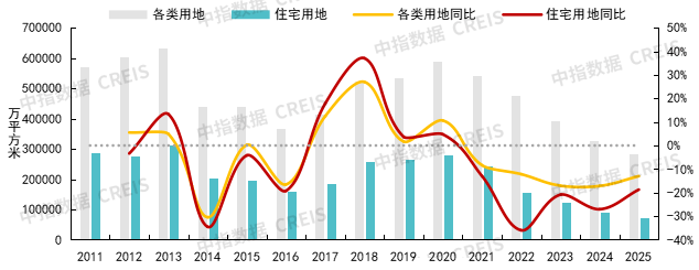 各类用地:根据中指数据,2025年,300城各类用地推出规划建筑面积为28.4亿平方米,同比下降13.0%,成交24.6亿平方米,同比下降10.4%。出让金方面,2025年,300城各类用地出让金3.3万亿元,同比下降11.4%。