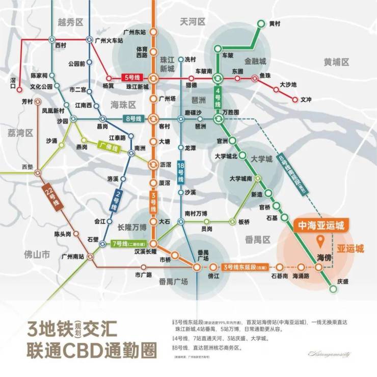 地铁交通:有海傍地铁站,4号线已开通,一线直达大学城,琶洲以及天河。3号线东延段,4站番禺广场5站南村万博CBD,穿过番禺广场,万博,珠江新城,白云新城,白云机场等重要商圈。还有一条就是规划的8号线延长线,这是一条需要等待的线路。