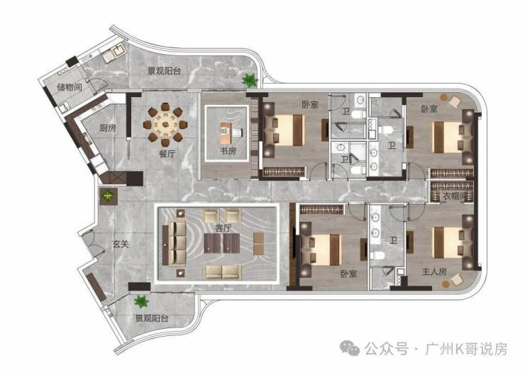 云起兴泰85-135㎡奢装洋房产品户型均为高拓展面积户型,入户花园、阳台、飘窗、卧室、露台等均有赠送空间;可随心打造成多功能百变空间,满足居者使用需求;推窗更可饱览水岸优质景观,为室内平添绿意。
