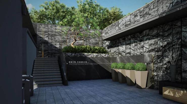 小区的空间布局遵循“一纵一环九节点”,整体为现代化简约风格,结合周边珍贵自然资源设计理念融合山色与流水概念,创造以“流动 的森林”为主题的园林。