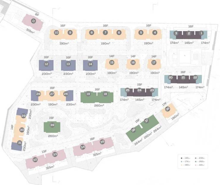 【户型面积】:145㎡三房、174㎡四房、190-315㎡五房