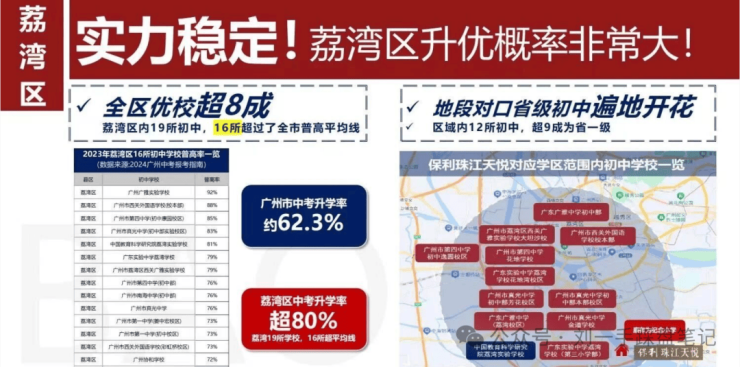 值得一提的是,因为这两个小区在同一个街道,还都是保利开发建设的,所以保利珠江天悦和保利珠江印象的业主大概率都能优先入学(具体还得看当年教育招生政策)。
