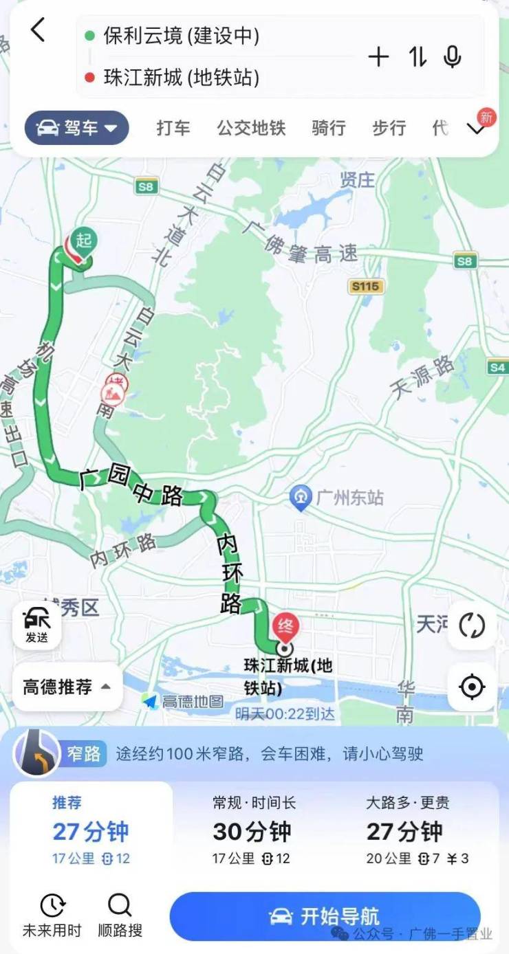 相较于小区距离地铁过远,驾车就方便很多,导航软件显示从楼盘出发,不堵车驾车27分钟就可以到珠江新城了。