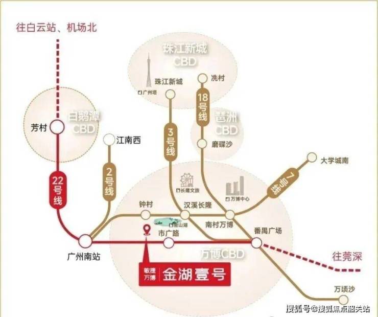 交通出行方面,项目周边有多条地铁线路覆盖,经高德地图实测,距离地铁 18 号线南村万博站约 600 米,步行 8 分钟可达;距离 7 号线万博站 D 出口约 800 米,22 号线市广路站也在 800 米范围内,通过 18 号线两站可到冼村,前往珠江新城十分便捷。