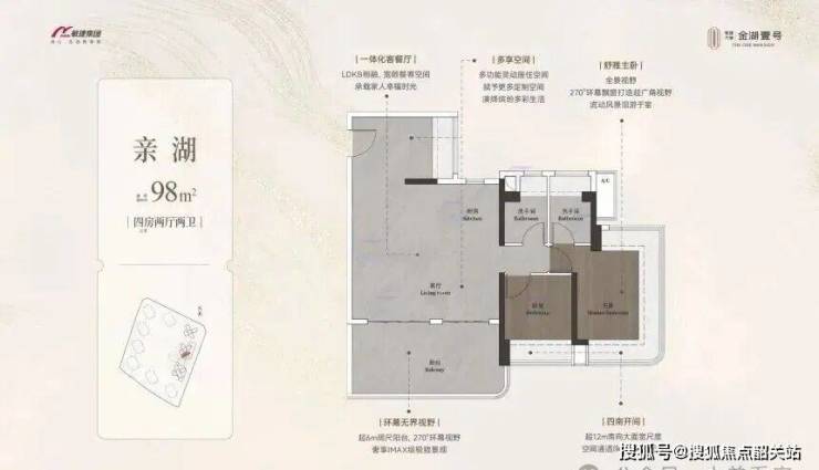 在售户型涵盖 四居室户型,98㎡四房单价与两居室相近,采用全南向设计,部分带有 270° 全景飘窗;