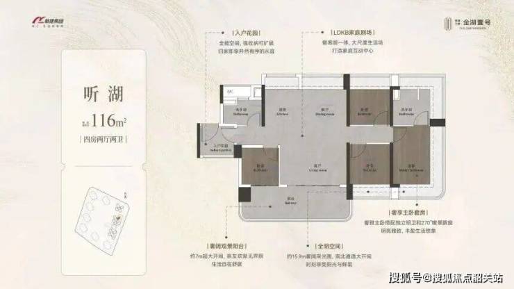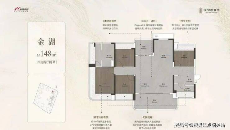 148-149㎡四房配备 LDKG 一体化设计,南向采光面可达约 16 米,部分房间能直接看到湖景,空间利用率较高。