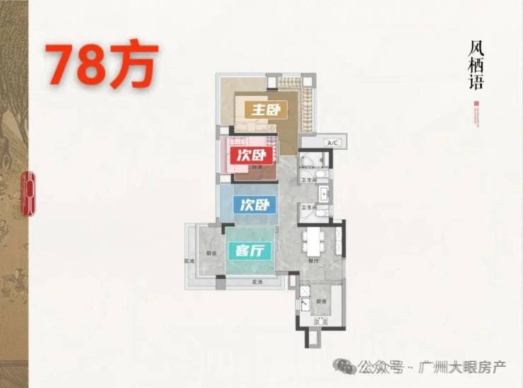 也有约110㎡的明星四房,客厅一面带飘窗,采光更佳,视野更开阔。